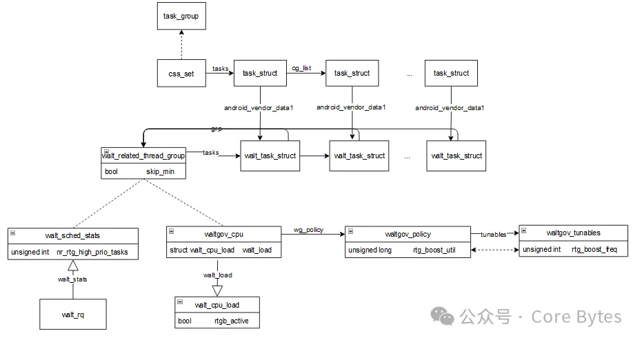 RTG在内核中定义了一个独立的结构体,但是它在内核中并非以一个独立的模块存在,而是散落在WALT的各处代码中: